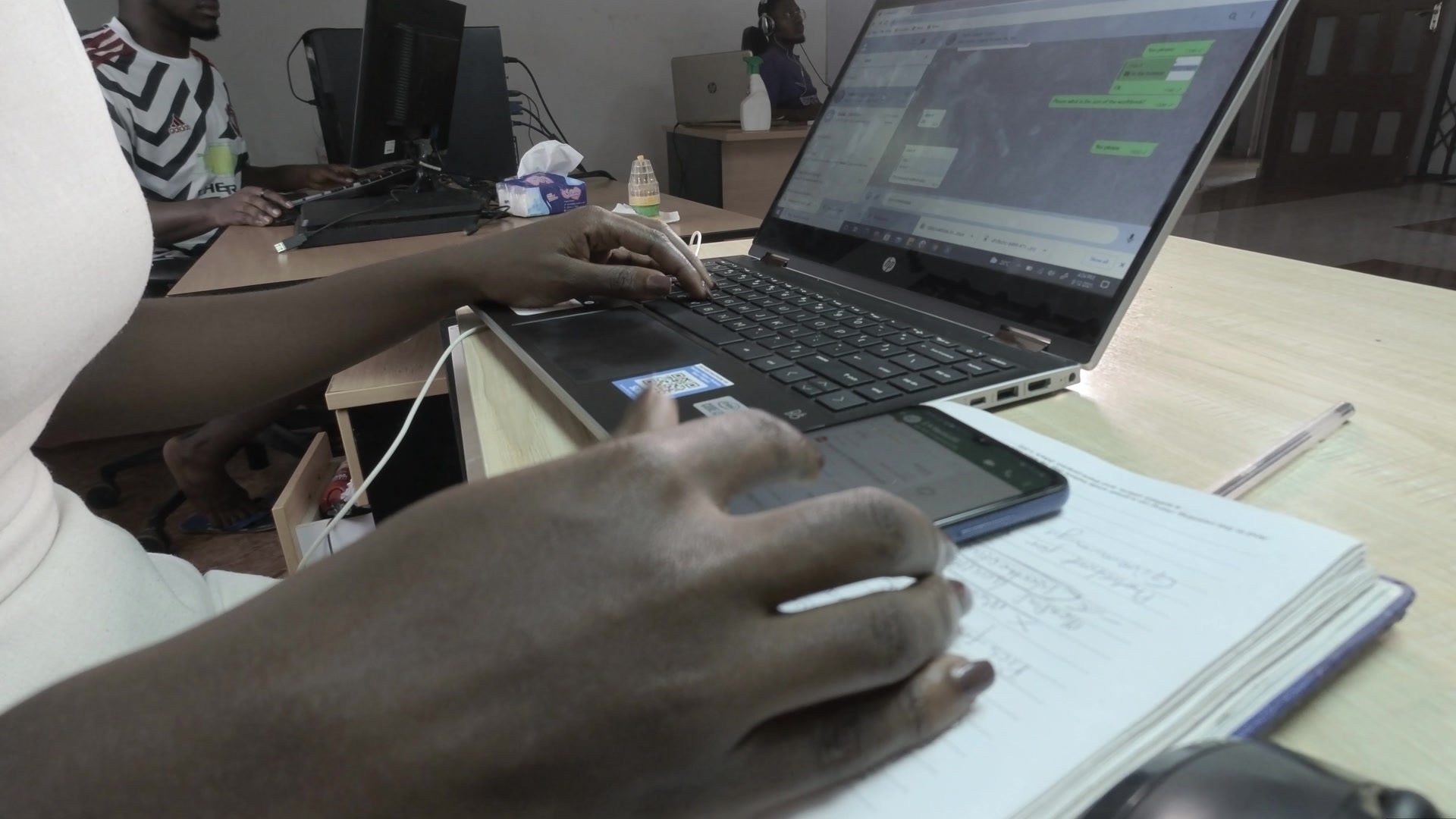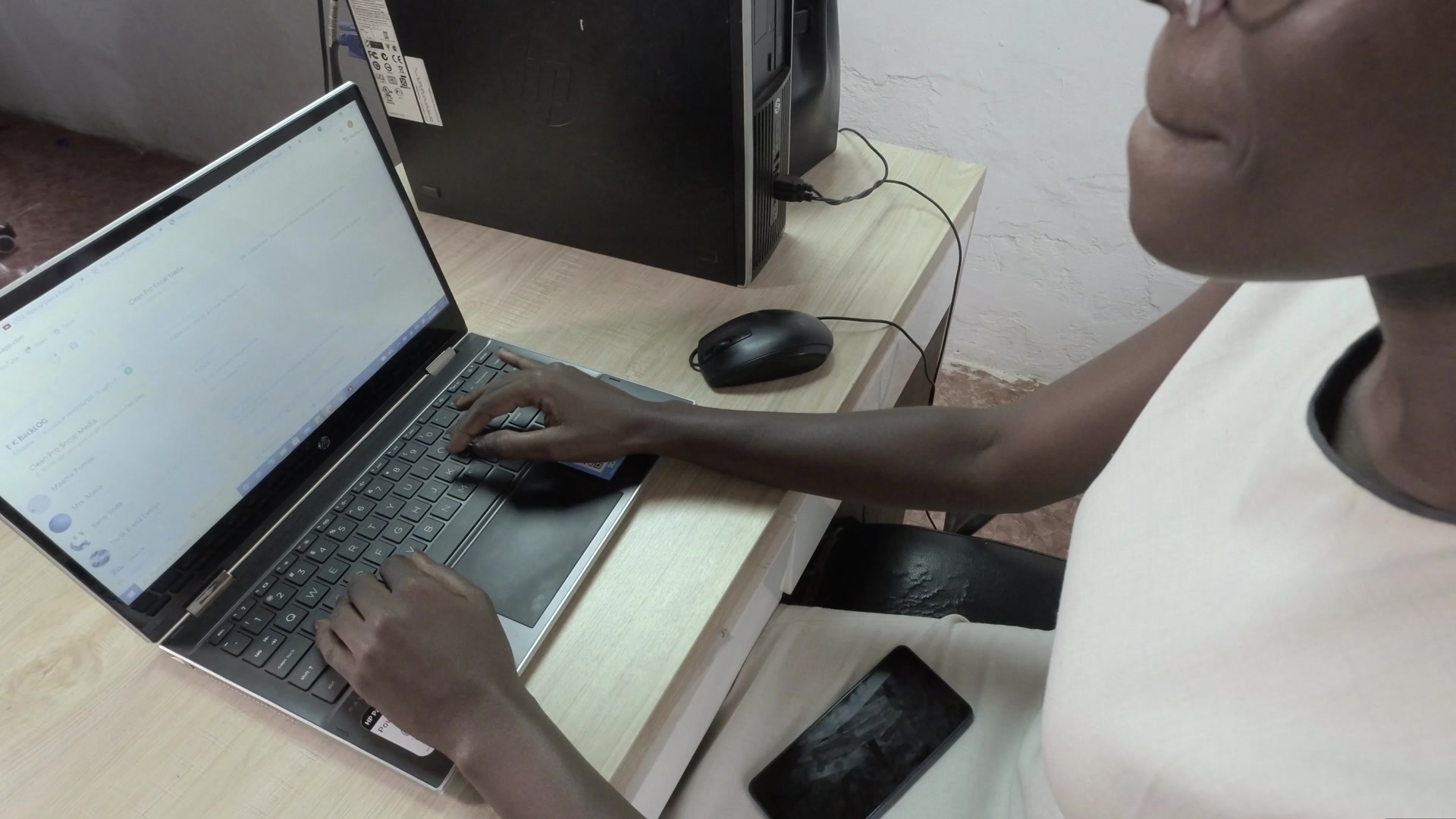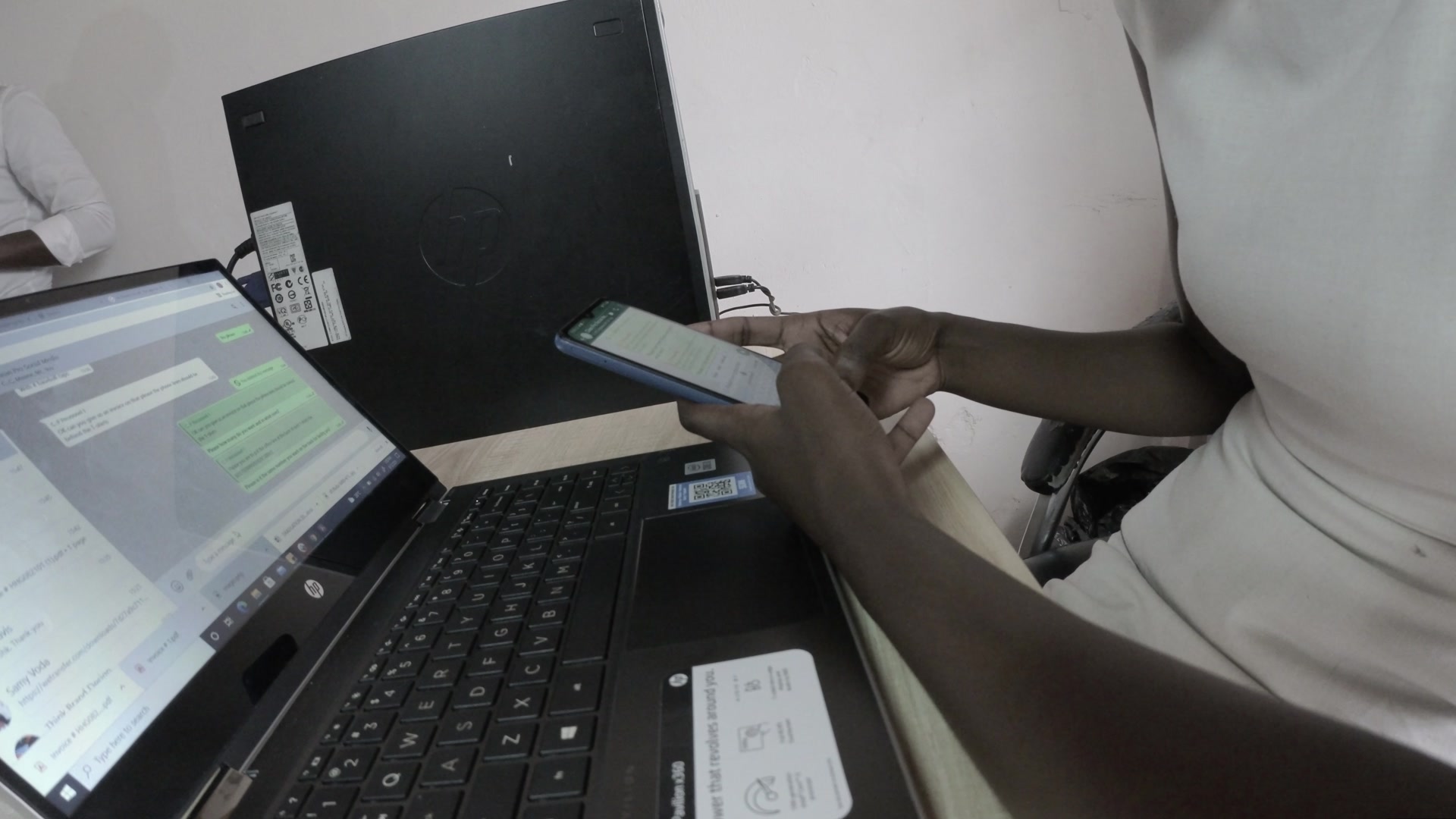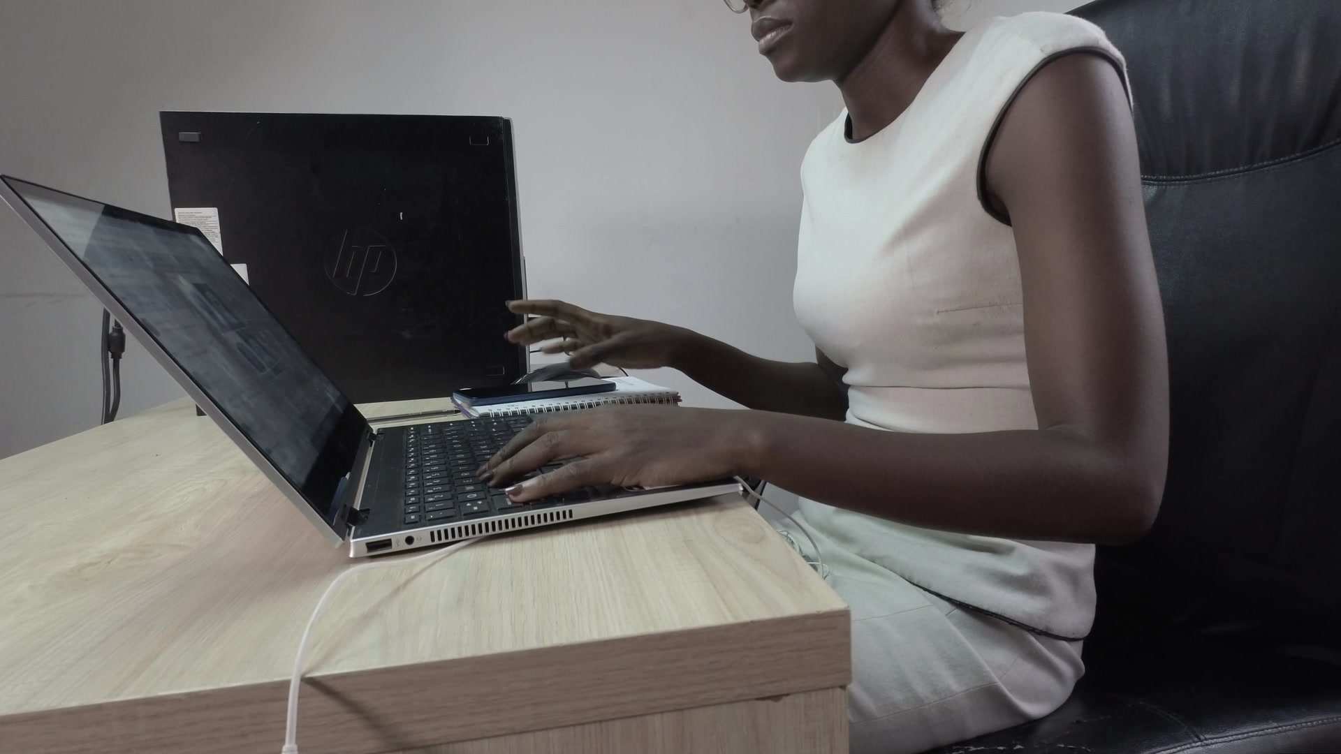 African Woman In Studio Behind Laptop Desk Office On Phone